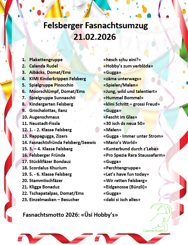 Eine Woche nachdem in vielen Orten die Fasnacht bereits vorbei ist, wird in Felsberg noch einmal richtig gefeiert. Die Organisation wird, wie alle Jahre, vom Felsberger Freizeitverein «Calanda Rudel» übernommen. Beim Calanda Rudel sind Alt und Jung aus dem ganzen Einzugsgebiet rund um Felsberg und Chur willkommen.